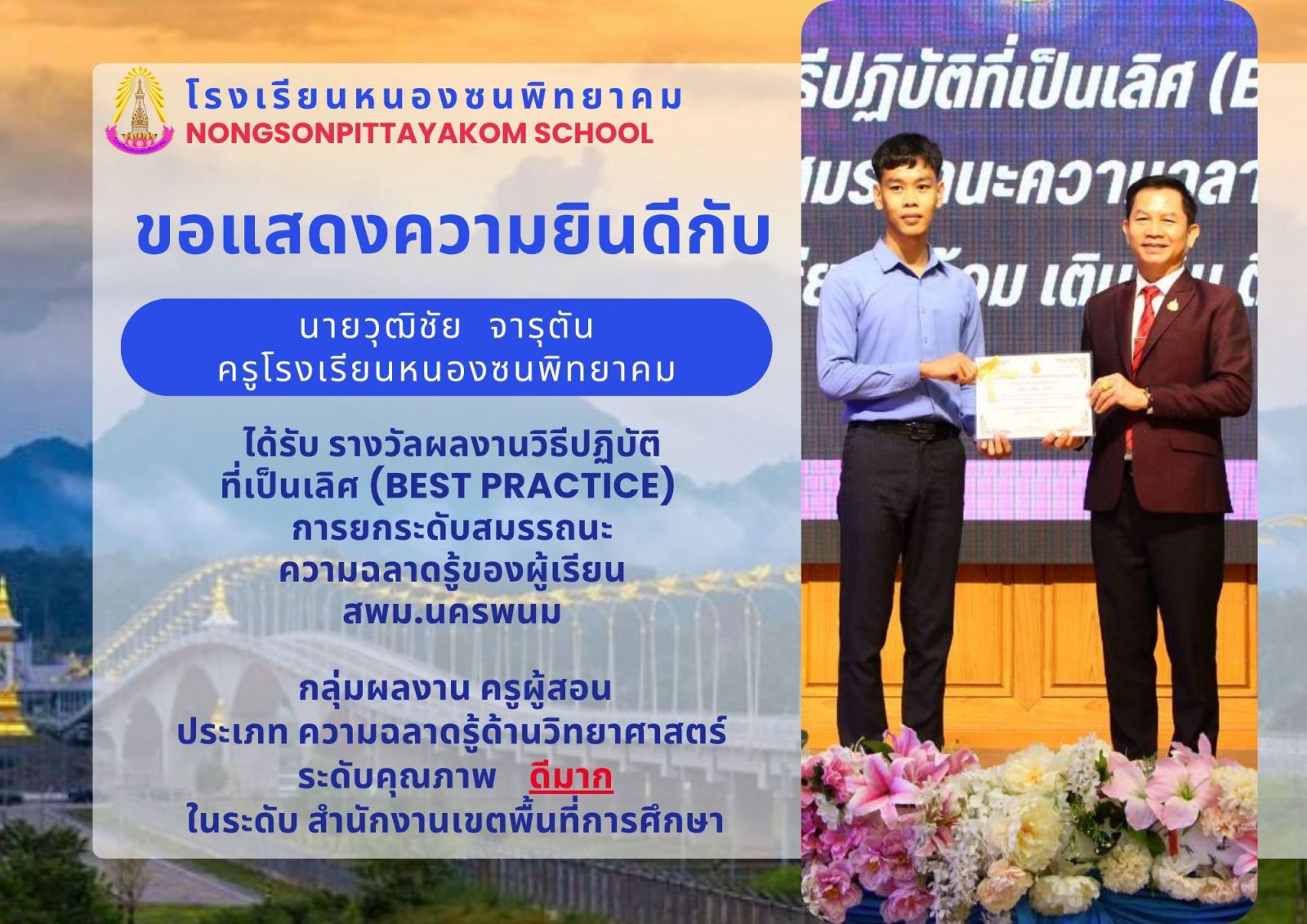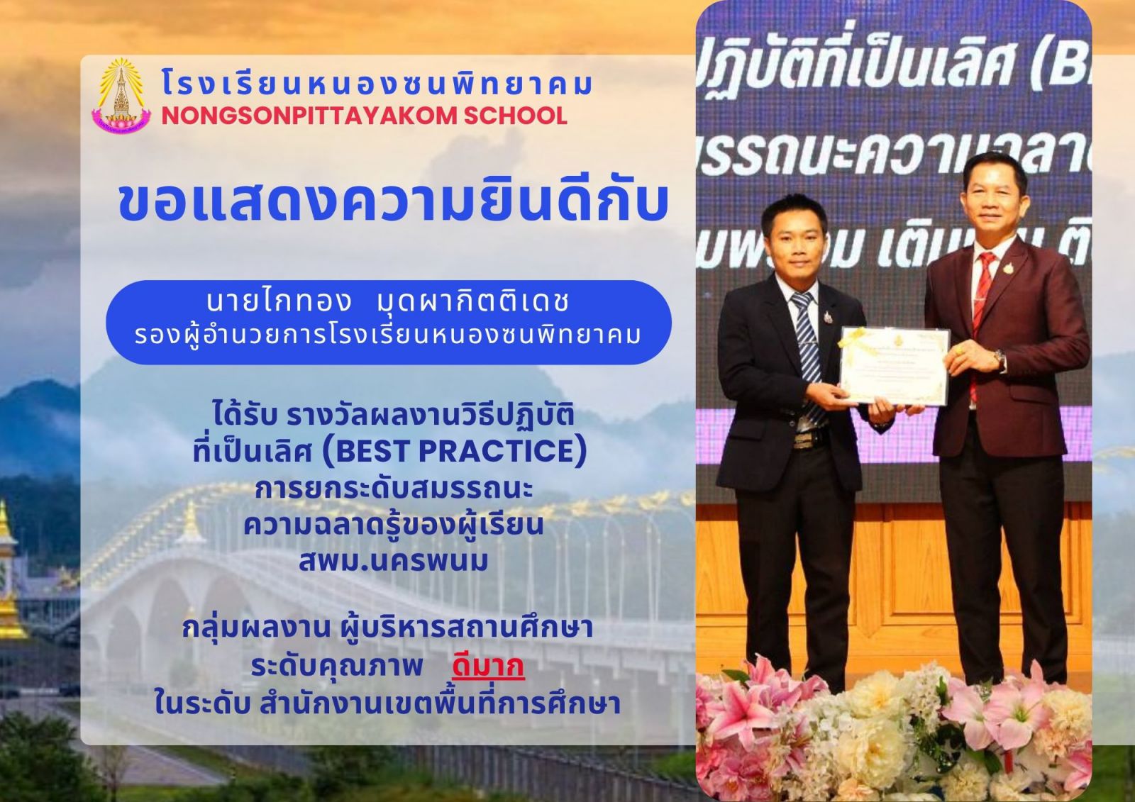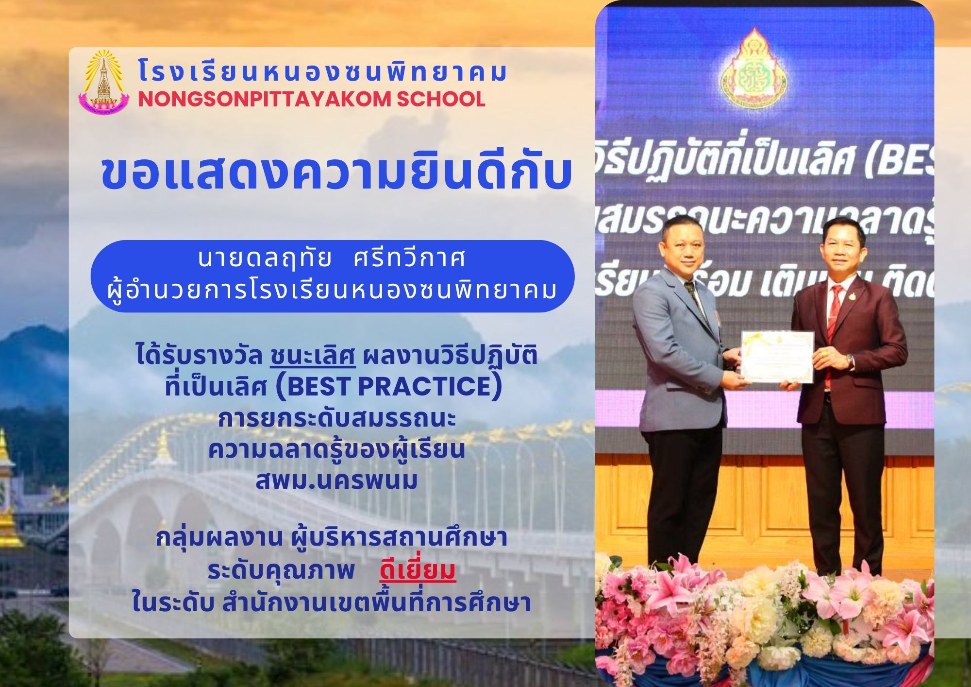 รับรางวัล ผลงานวิธีปฏิบัติที่เป็นเลิศ (Best Practice) การยกระดับสมรรถนะความฉลาดรู้ของผู้เรียน
