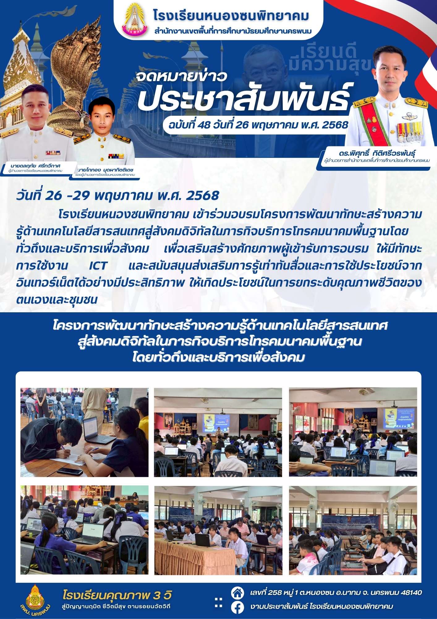 โรงเรียนหนองซนพิทยาคม เข้าร่วมอบรมโครงการพัฒนาทักษะสร้างความรู้ด้านเทคโนโลยีสารสนเทศสู่สังคมดิจิทัลในภารกิจบริการโทรคมนาคมพื้นฐานโดยทั่วถึงและบริการเพื่อสังคม